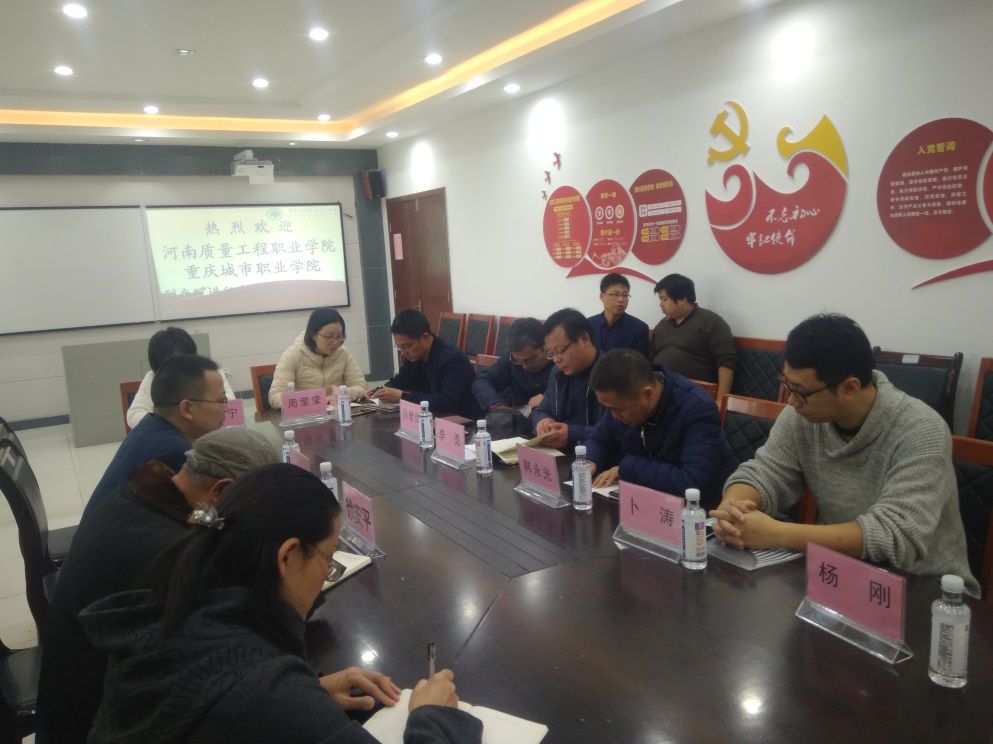 1115日上午,系主任韩永光一行3人及河南质量工程职业公司建筑工程系主任李勇一行5人到重庆工程职业技术公司交流调研。与会三方就现代学徒制、专业建设、实训室建设、教学诊改、员工技能竞赛等议题进行了深入交流,座谈结束后参观了市政工程技术、建筑工程技术等专业实训基地。