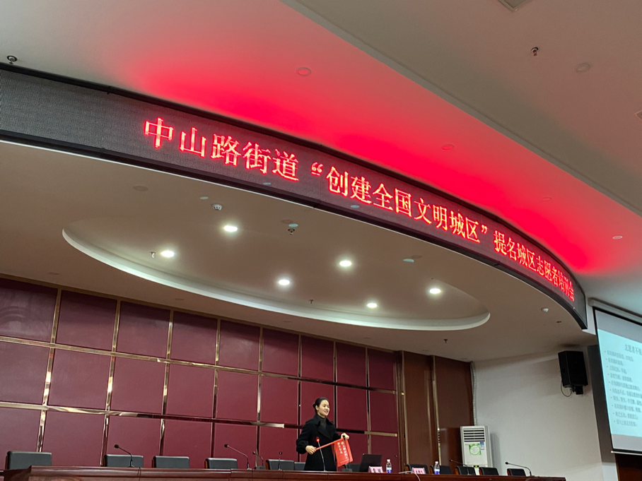 11月24日下午两点三十分,建筑工程系教工支部委员鹿瑶作为党员志愿者代表在中山路街道办事处参加“创建全国文明城区”提名城区志愿者培训会。